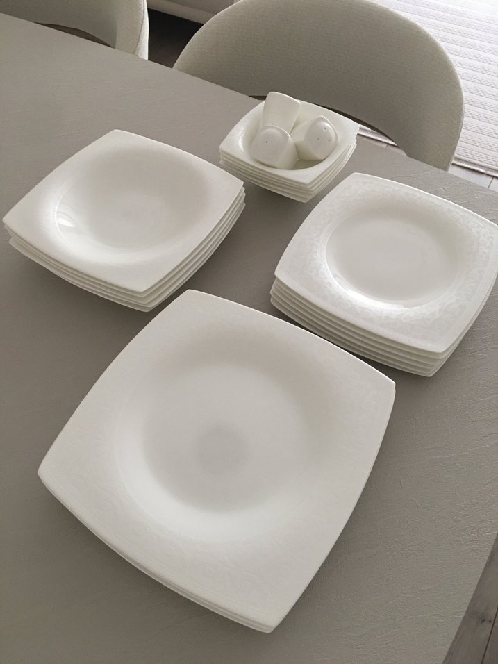 6 Adet Yemek Tabağı (24.5 cm) 6 Adet Servis Tabağı (28.5 cm) 6 Adet Pasta Tabağı (23.5 cm) 6 Adet Çorba Kasesi (16 cm) 1 Adet Tuzluk 1 Adet Biberlik 1 Adet Kürdanlık Karaca Fıne Pearl İnci serisidir takım 12 kişilik satışa koyduğum 6’lı yani toplam 27 parça hiç kullanılmadı sıfırdır. Kutusu yoktur. Herhangi bir kusuru yoktur. 6’lı bana yetiyor 12 kişilik fazla geldiği için satıyorum. (Ankra)