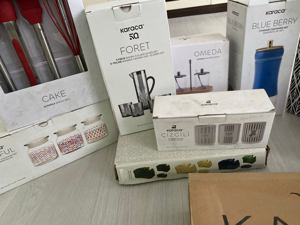 Karaca Foret 5 parçadan oluşan cam su sürahisi ve bardak seti, şık tasarıma sahip. Ayrıca Karaca Çizgili ve Omeda baharat setleri de yer alıyor. Ürünler yeni geldi kutulu fiyat sorunuz