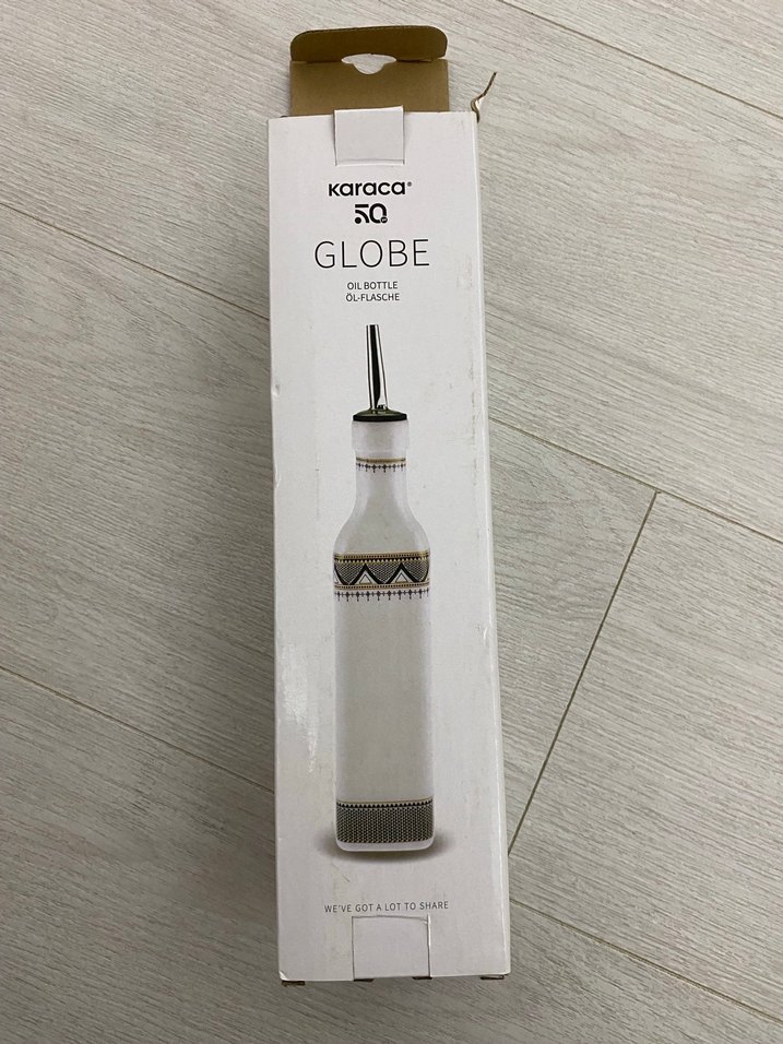 Karaca Globe beyaz yağ şişesi, 50 ml kapasite, gri dekoratif desen ve metal dökme ağızlı.kutu kullanılmamış ürün kutulu