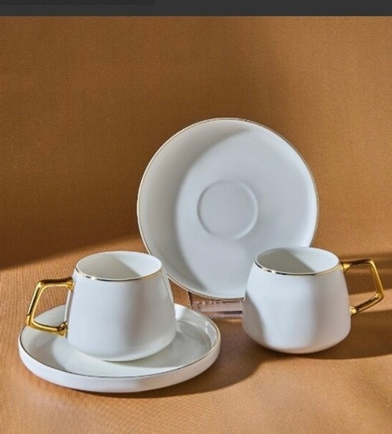 İnce altın sap ve kenar detaylarına sahip beyaz fincan takımı, uyumlu tabaklarla birlikte sunulur. Sıcak içecekler için şık ve pürüzsüz tasarım ☕