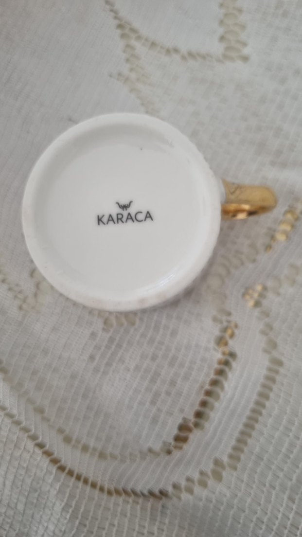 Karaca markalı, beyaz ve gri renklerde seramikten yapılmış, altın renkli saplı bir kupa. ☕