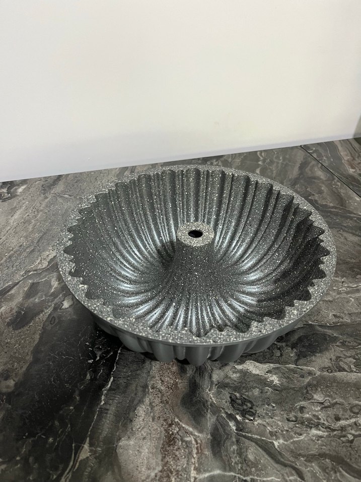 Gri kek kalıbı, ortasında delik ve dalgalı tasarıma sahip. Yapışmaz yüzeyi ile keklerin kolayca çıkarılmasını sağlar.