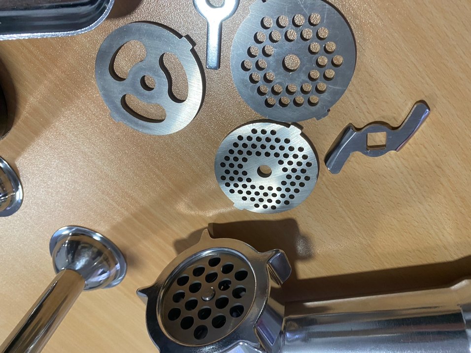 Gri renkte, paslanmaz çelikten yapılmış farklı bıçak ve disklerden oluşan kıyma sucuk aparatı