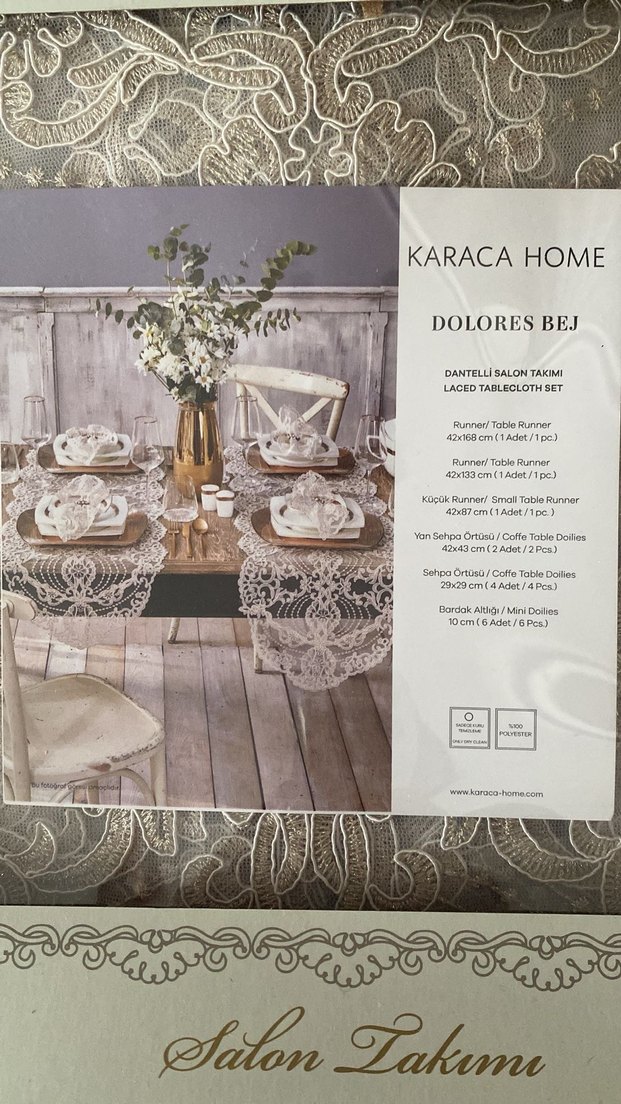 Karaca Home Dolores Bej dantelli salon takımı, bej ve gri bohem desenli, masa örtüsü ve kahve sehpası dantellerinden oluşur.