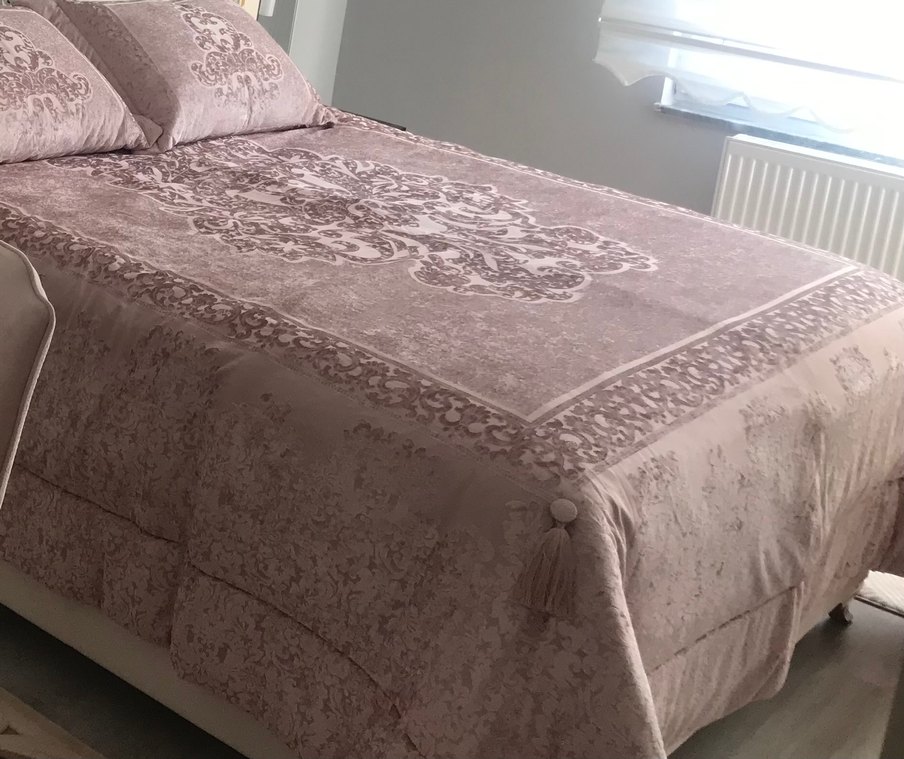 Pudra renkli, zarif nakış desenleri ve yumuşak pastel tonuyla odanıza şık bir dokunuş katar. Köşelerinde püsküller bulunur. ️yatak örtüsü ve yastık kılıfı şeklinde satılıktır. Ürün hiç kullanılmadı. Kutusu mevcut değil uygun bir kutuyla gönderim sağlanacaktır. İhtiyaç fazlası olduğu için satıyorum.