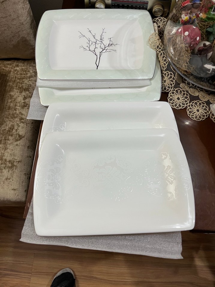 Beyaz porselen yemek kapları, hafif dekoratif desenlerle. Sofranıza şıklık katan zarif tasarım. ️