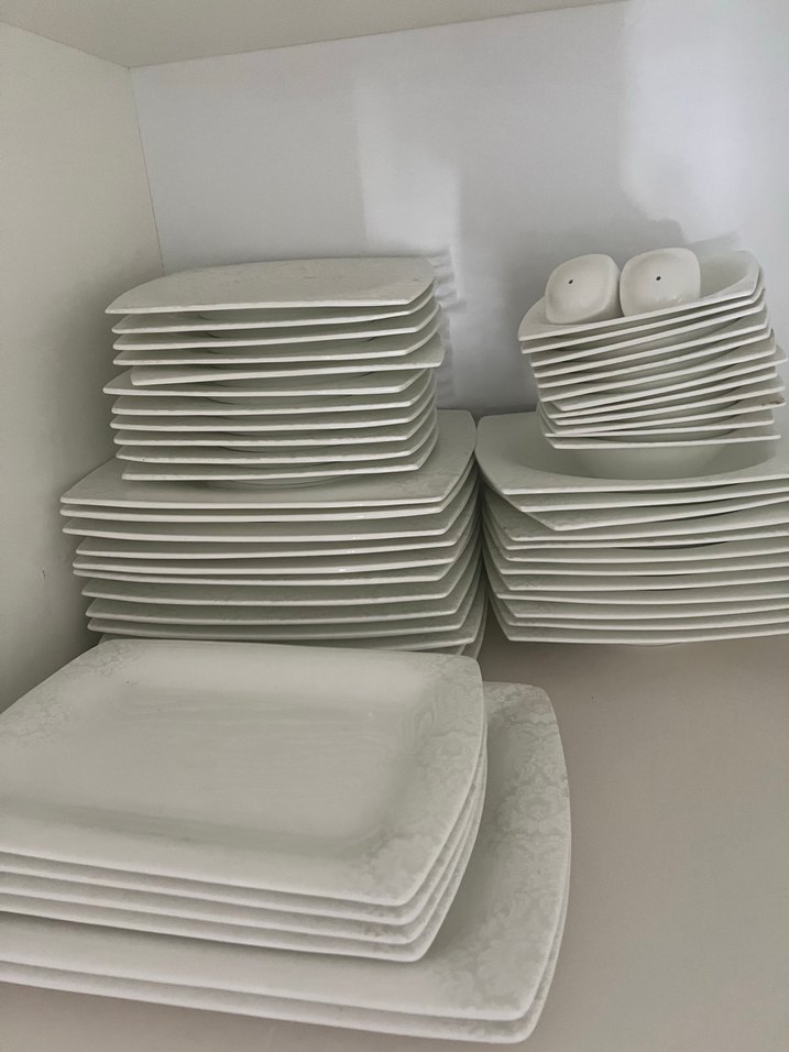 İstanbul için elden teslim yapabilirim. Farklı boyutlarda beyaz ve gri desenli yemek tabakları seti. Pürüzsüz ve şık tasarıma sahiptir. Kahvaltı için fincan seti de vardır.