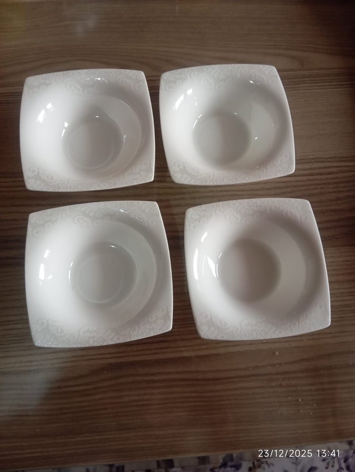 Dört adet beyaz kare şeklinde, hafif desenli yemek kabı seti. Yemek sunumu için uygundur. ️