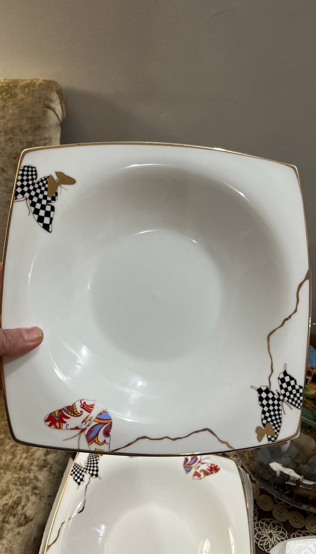 Kelebek desenli, altın detaylı beyaz porselen kare yemek