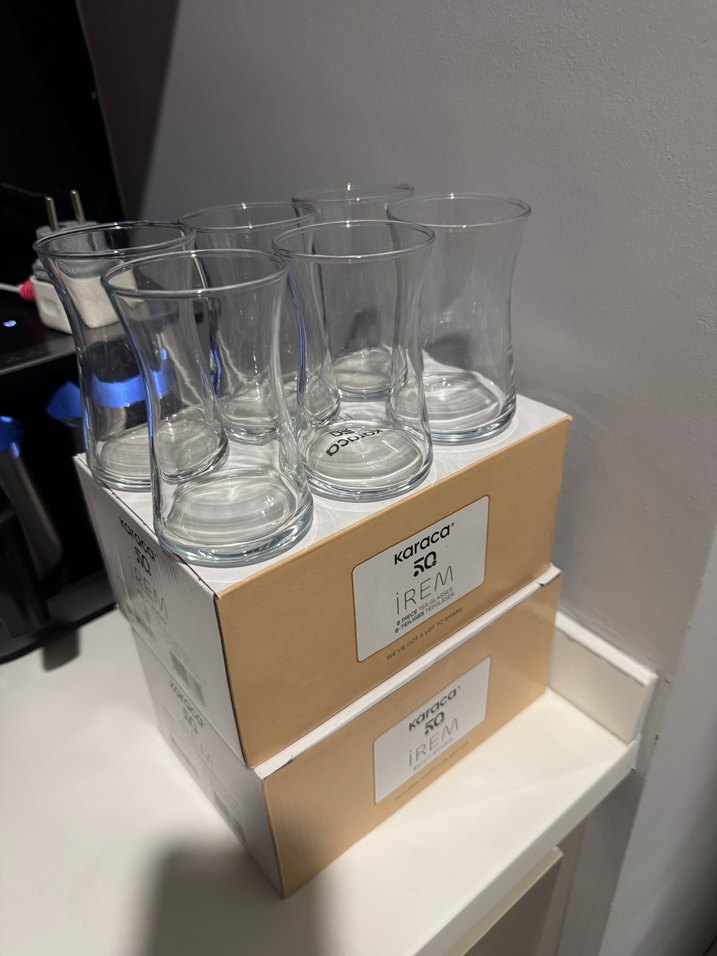 Karaca İrem seti, üzerinde kutularla birlikte altı adet klasik ince belli çay bardağı içerir. Her bardak şeffaf camdan yapılmıştır.