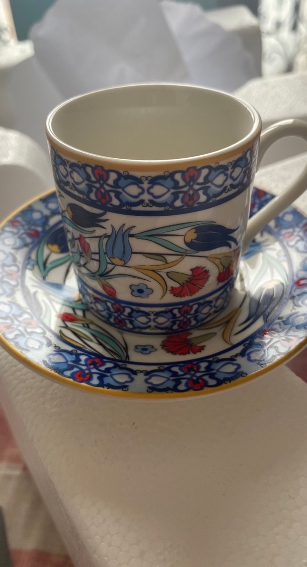 Altın detaylı, koyu renkli çok renkli çiçek desenli porselen fincan ve tabağı. Sıcak içecekler için Tekli ürün kullanılmamıştır ,hiçbir sıkıntısı yoktur. ☕
