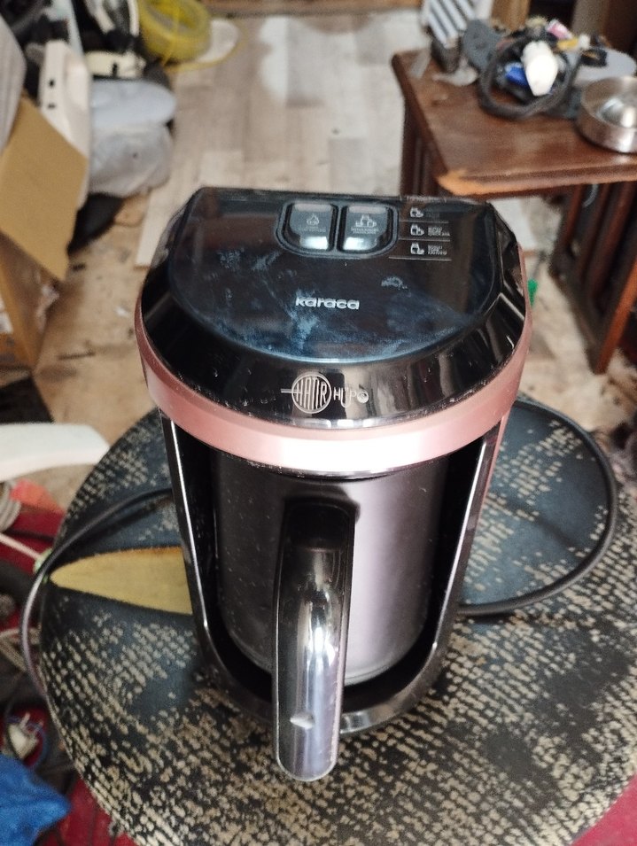 Karaca kahve makinesi, koyu kahverengi renkte olup üstte kullanımı kolay düğmelere sahiptir. Kolay dökme için sapı ve kompakt tasarımı bulunur. ☕
