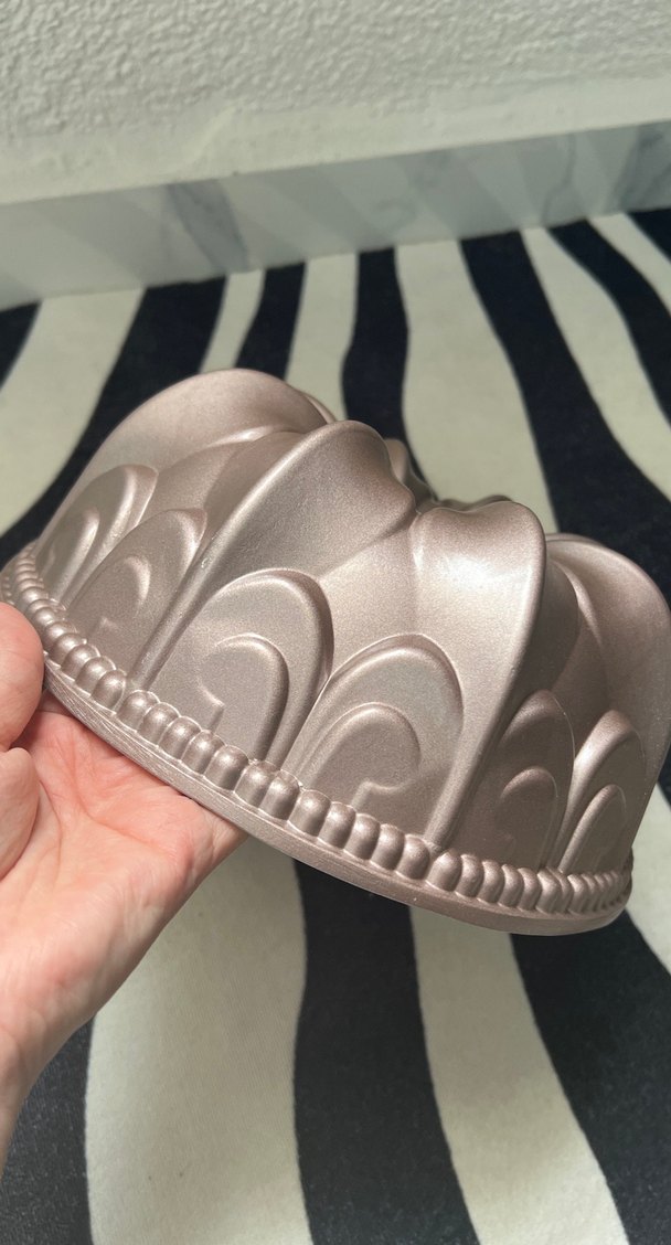 Parlak bej renkte, detaylı desenli ve sağlam yapıya sahip kek kalıbı.