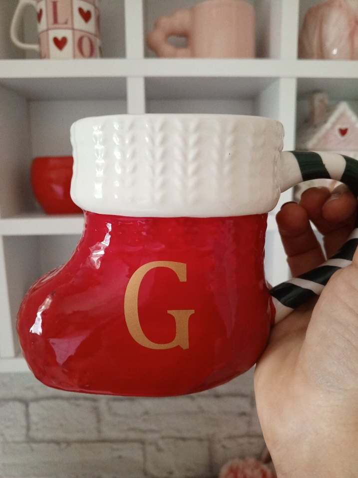Kırmızı çorap şeklinde, beyaz örgü görünümlü ağızlı, önünde altın renkli "G" harfi bulunan kupa. Kulpu siyah beyaz çizgili. ☕