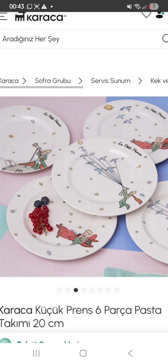 Karaca imzalı, Küçük Prens temalı 6 adet beyaz tatlı tabağı. Hafif ve şık desenleriyle tatlılarınızı sunmak için ideal. hiçbir kusuru yok tertemiz