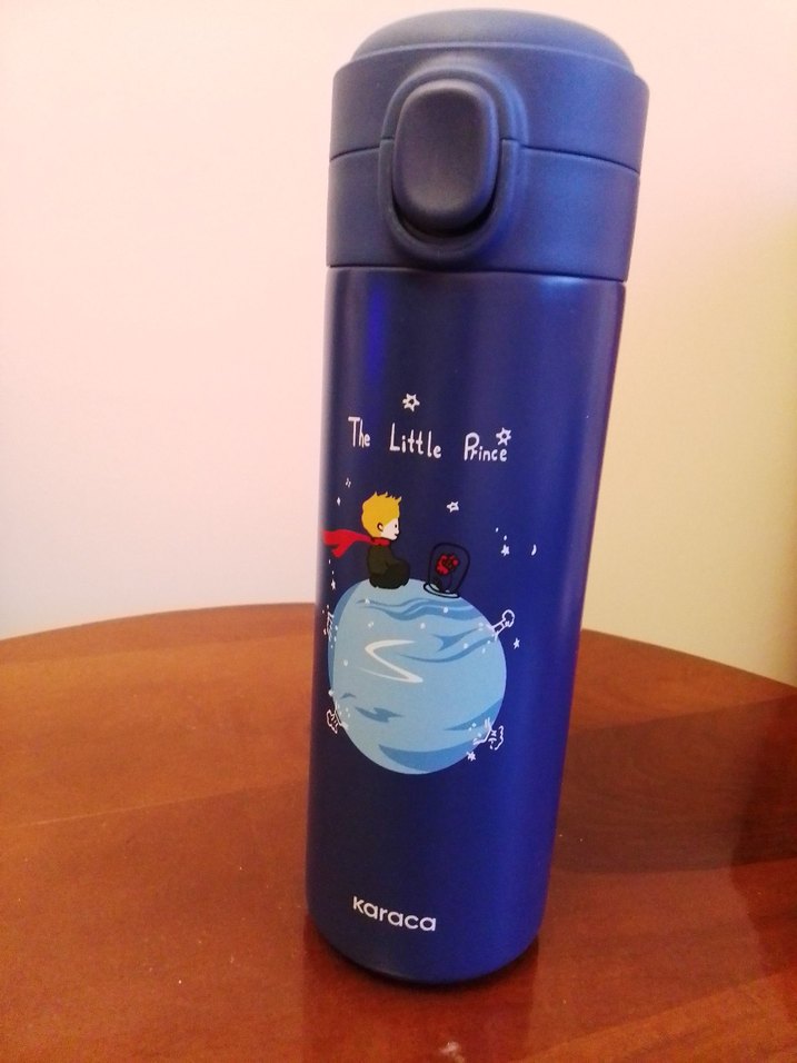 Karaca markalı koyu mavi Çelik termos, Küçük Prens desenli ve güvenli açma kapama kapağı ile çocuklar için uygundur.