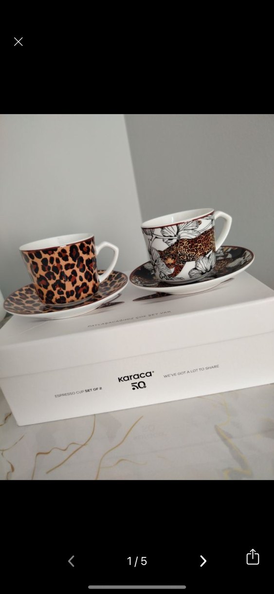 Karaca marka, kahverengi tonlarında leopar desenli iki kahve fincanı ve tabak seti. Hayvan ve çiçek desenleriyle şık bir kombinasyon.