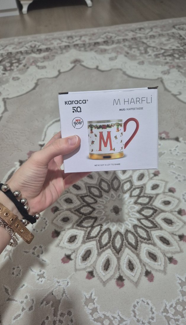 Karaca markasının M harfi ve çiçek desenli beyaz kupası, altlık ile birlikte sunulur. Kahve veya çay için uygundur. ☕