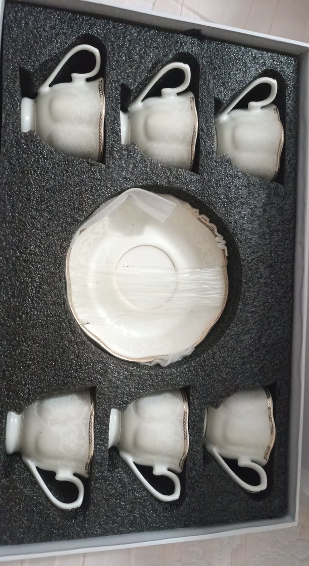 Altı adet gri detaylı beyaz porselen kahve fincanı ve tabakları ile şık bir set. Kulpları zarif, desenleri ince detaylıdır. ☕️