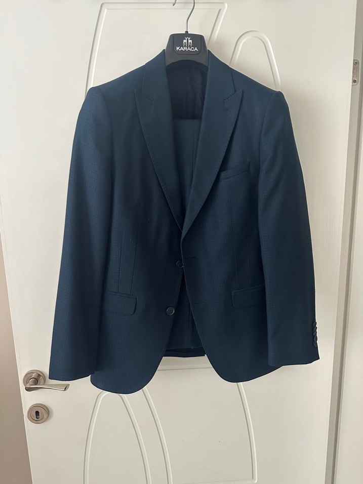 Lacivert renkli, slim fit ve klasik yakalı erkek takım elbise ceketi. Ofis kullanımı için uygun