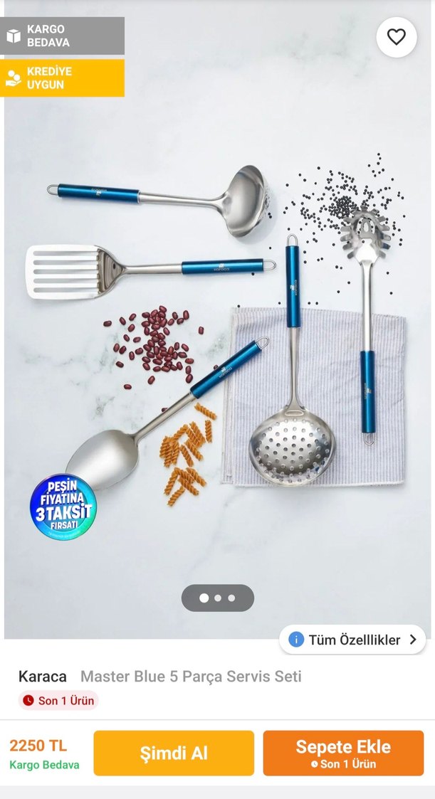 Mavi saplı ve paslanmaz çelik başlıklı Karaca Master Blue 5 parça mutfak servis seti, kepçe, delikli kaşık, spatula ve diğer parçaları içerir.