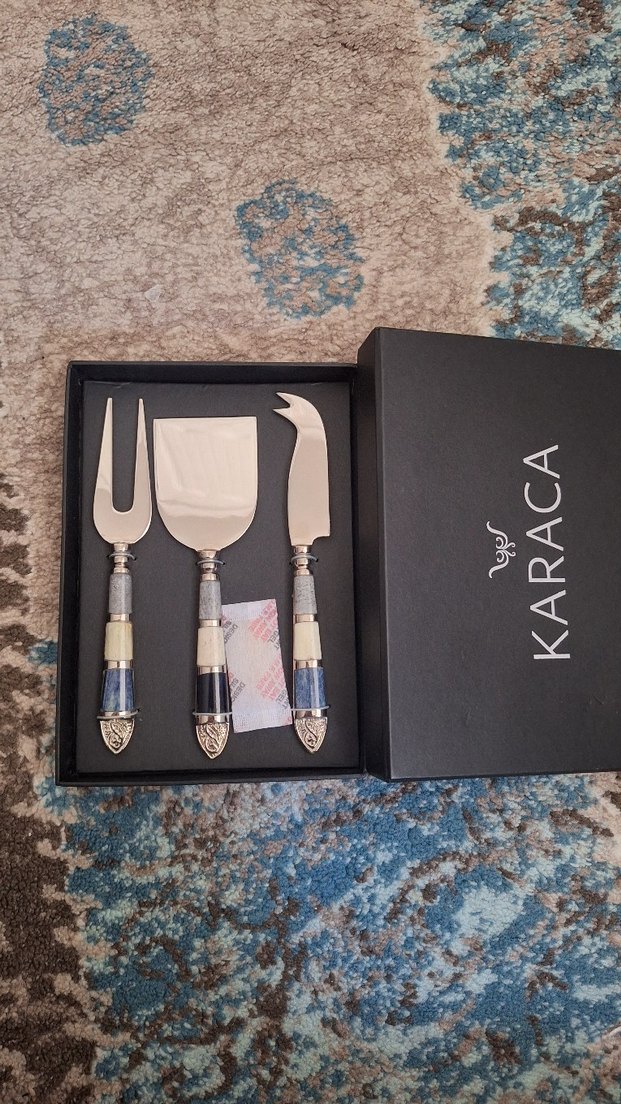 Karaca markasına ait koyu mavi saplı, peynir servisinde kullanılan üç parçalı bıçak seti. küçüktür