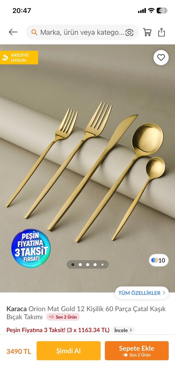 Karaca Orion mat altın kaplama, 12 kişilik 60 parçadan oluşan çatal, bıçak ve kaşık setidir. Şık ve modern tasarıma sahiptir.