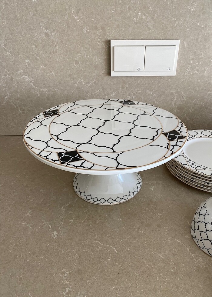 Karaca pasta takımı. 6 adet pasta tabağı, 6 adet çay fincanı, 6 adet çay fincan tabağı ve bir adet kek standından oluşmaktadır. Herhangi bir kusuru yoktur ve sayılı kullanılmıştır. Ürünün kendi kutusu yoktur farklı bir kutuya tek tek patpatlanıp sarılarak gönderilecektir.