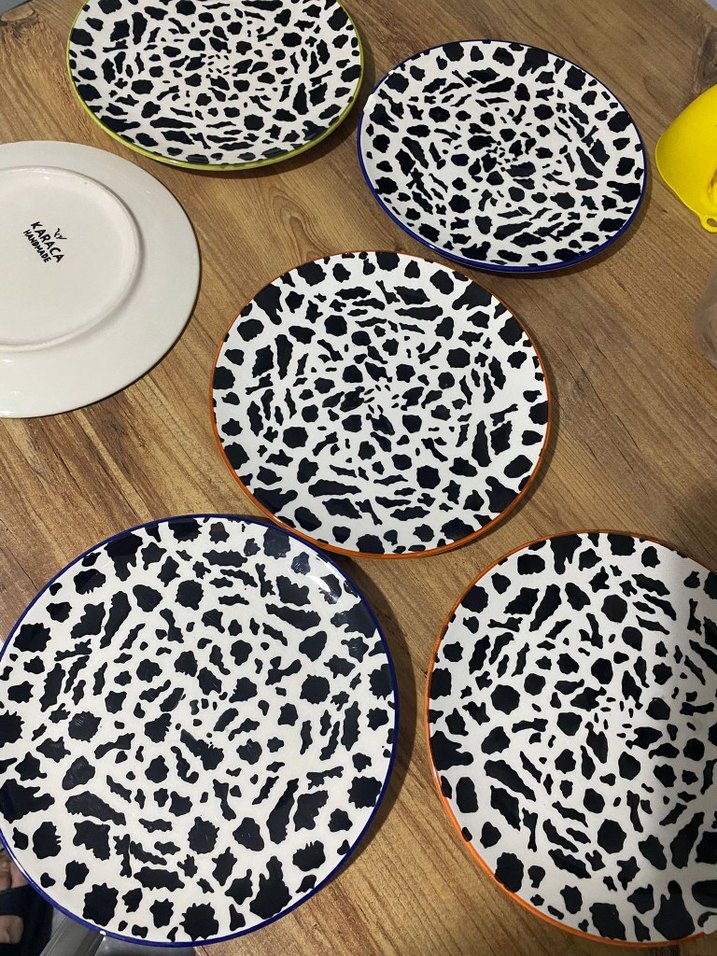 2 sinde deforme var fiyatini makul tutuyorum siyah beyaz leopar desenli, kenarları renkli tabak seti, yemek sunumu için uygun.