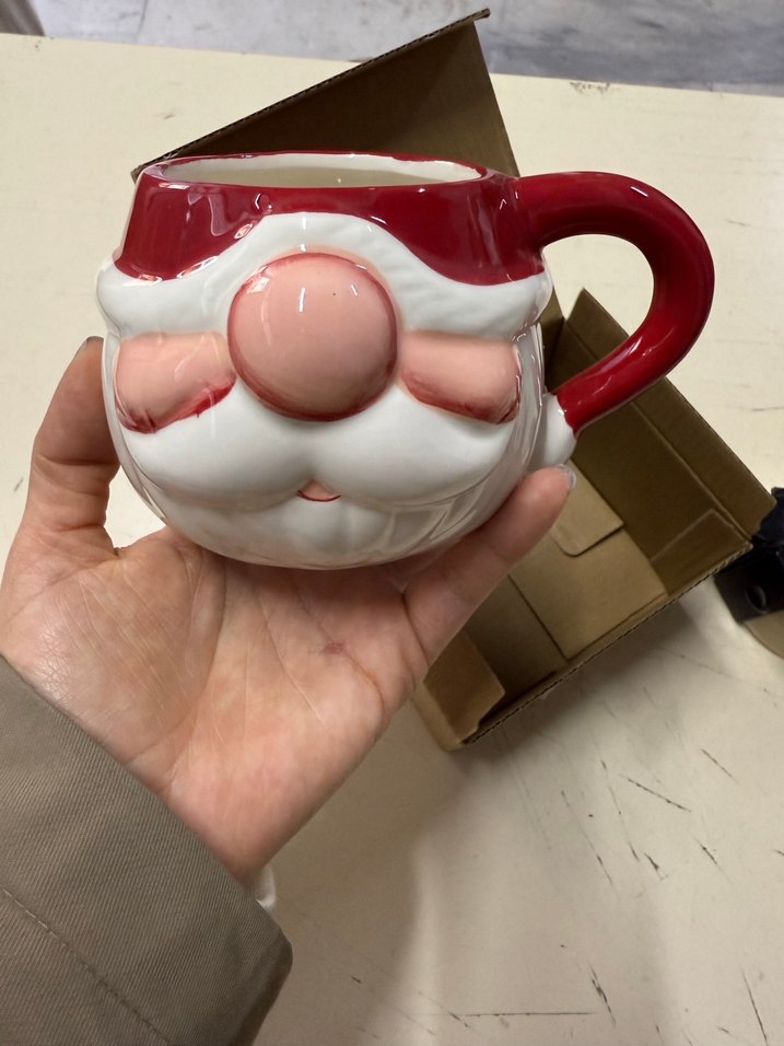 Fabrikadan kaynaklı defosu vardır resimlerde çektim sıfır üründür başka hiçbir sorunu yoktur. Pastel kırmızı renkte, büyük burunlu ve pembe yanaklı 3D Noel Baba yüzü tasarımlı kupa. Kulpu kırmızı renktedir.