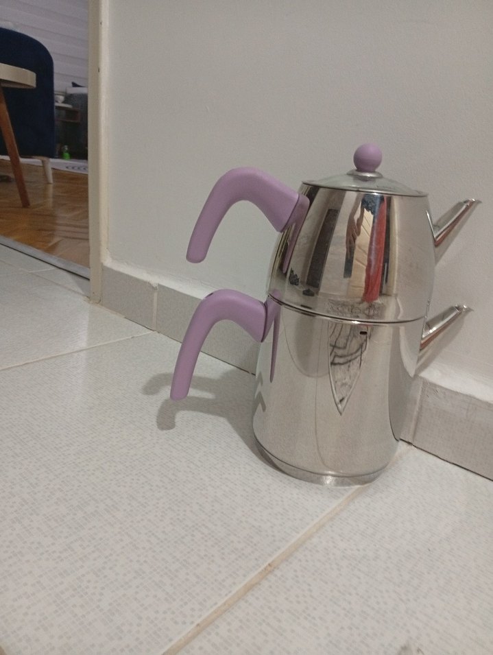Paslanmaz çelikten yapılmış, pastel mor saplı ve düğmeli iki parçalı çaydanlıktır. Çay demlemek ve sunmak için uygundur. ☕ Karaca marka