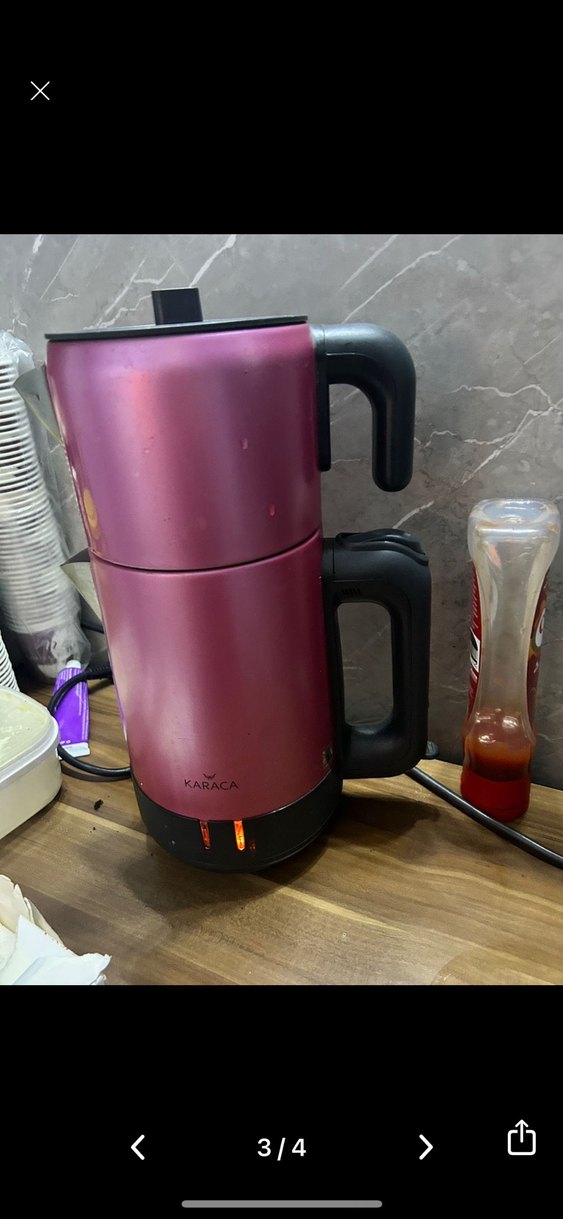 Karaca marka koyu pembe renkli çay makinesi, siyah saplı ve kompakt tasarıma sahip. Isıtma tabanı ve gösterge ışıkları bulunur.