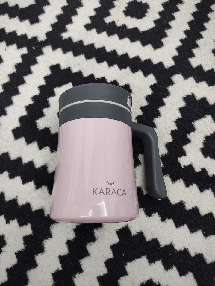 Karaca markalı, pembe gövde ve gri saplı termos matara, içeceklerinizi sıcak veya soğuk tutar. Taşıması kolay saplıdır. ☕