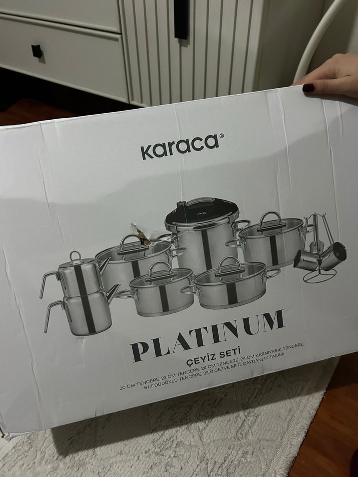 Karaca Platinum çeyiz seti, gri ve beyaz renklerde çeşitli kapaklı tencere ve tavalar içerir, dayanıklı ve kullanışlı mutfak gereçleridir. İÇİNDEN SADECE DÜDÜKLÜSÜNÜ ALDIM ÇEYİZ İÇİN ALMIŞTIM HİÇ KULLANILMADI