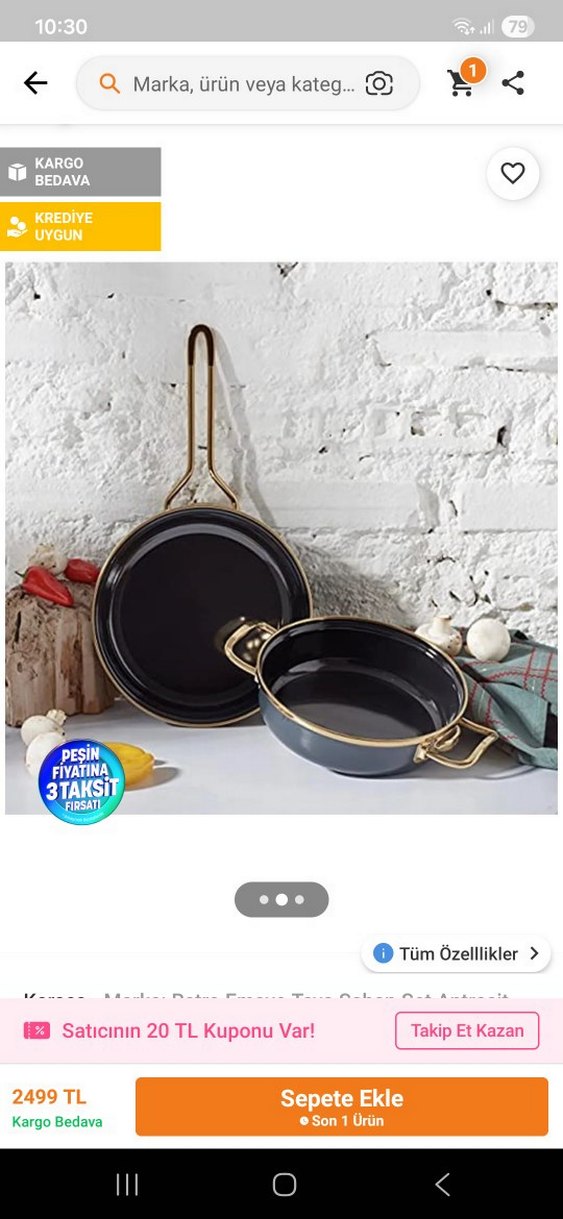 Altın renkli kulplara sahip siyah tava ve sahan seti, sağlam yapısıyla mutfağınızda şık bir seçenek sunar. Sıfır ürün
