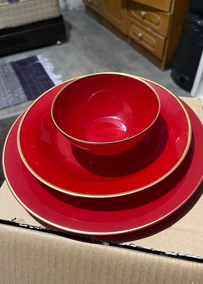 Karaca retro serisi yemek takımı kırmızıdır. Kutuludur. 6 kişilik 18 parça