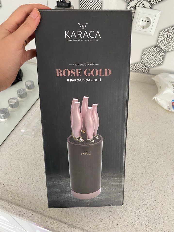 Karaca Rose Gold 6 parça bıçak seti, ergonomik saplar ve şık bir bıçak bloğu ile birlikte gelir. Bıçaklar koyu rose gold renktedir.