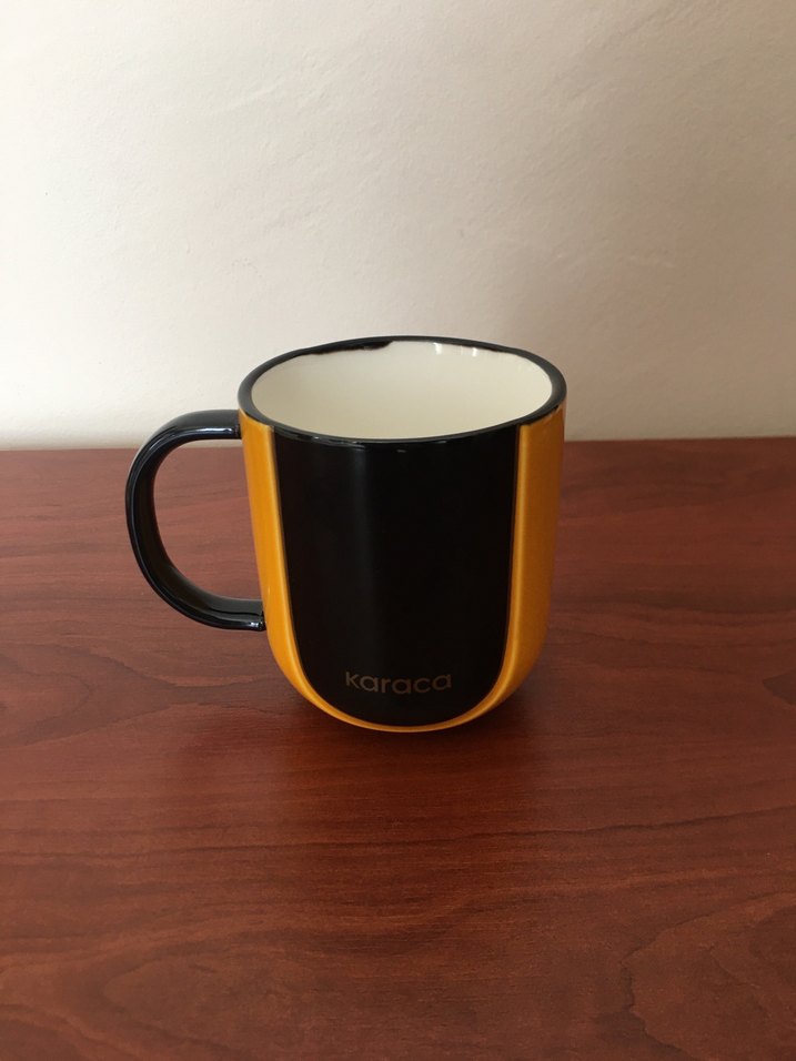 Karaca marka, koyu sarı ve siyah renklerde, seramikten yapılmış kulplu kupa. ☕
