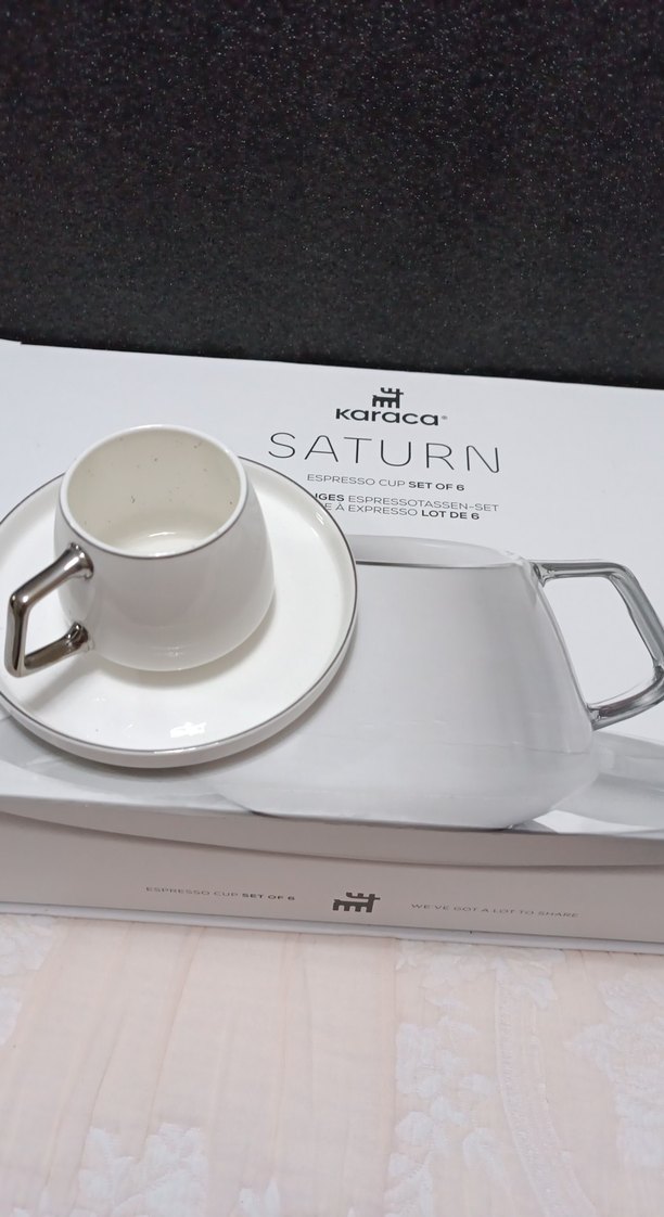 Karaca Saturn seti, altılı beyaz espresso fincan ve tabaklarından oluşur. Her fincanın kare şeklinde gri kulpu vardır. Espresso sunumu için uygundur. ☕ ürün yeni olup kutusu hafif hasarlı fotoda belirttim