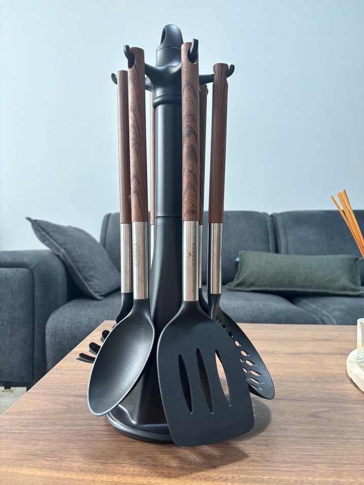 Ahşap saplı koyu kahverengi mutfak gereçleri seti, siyah döner standlı. Hiç kullanmadım. Teklife açığım
