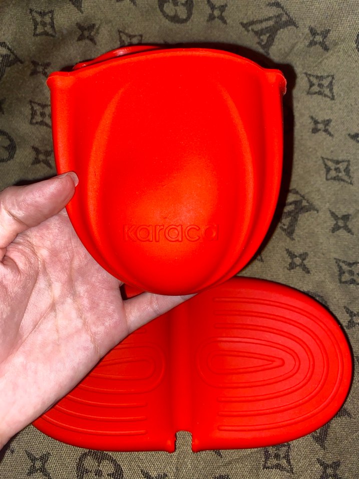 Karac markasına ait kırmızı silikon fırın eldiveni, sıcak tencere ve tavaları tutmak için kullanılır. Düz ve kaymaz yüzeye sahiptir.
