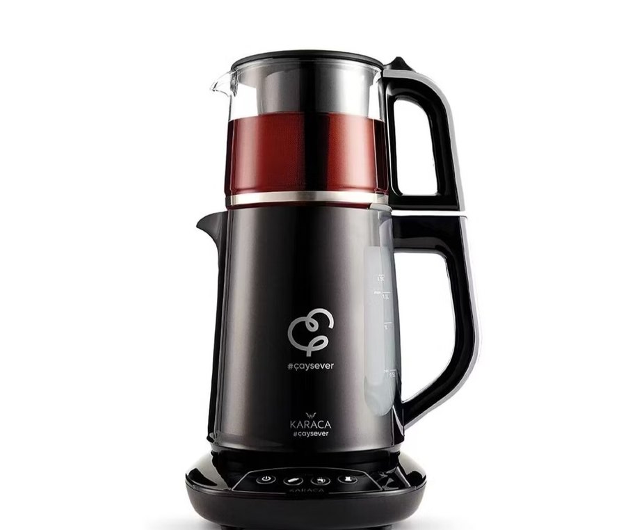 ceyizime hediye geldi kutusunda hiç açılmamış Karaca siyah çay makinesi, modern tasarımı ve koyu renk seçeneği ile dikkat çeker. Cam demliği ve kontrol düğmeli sağlam tabanı vardır.