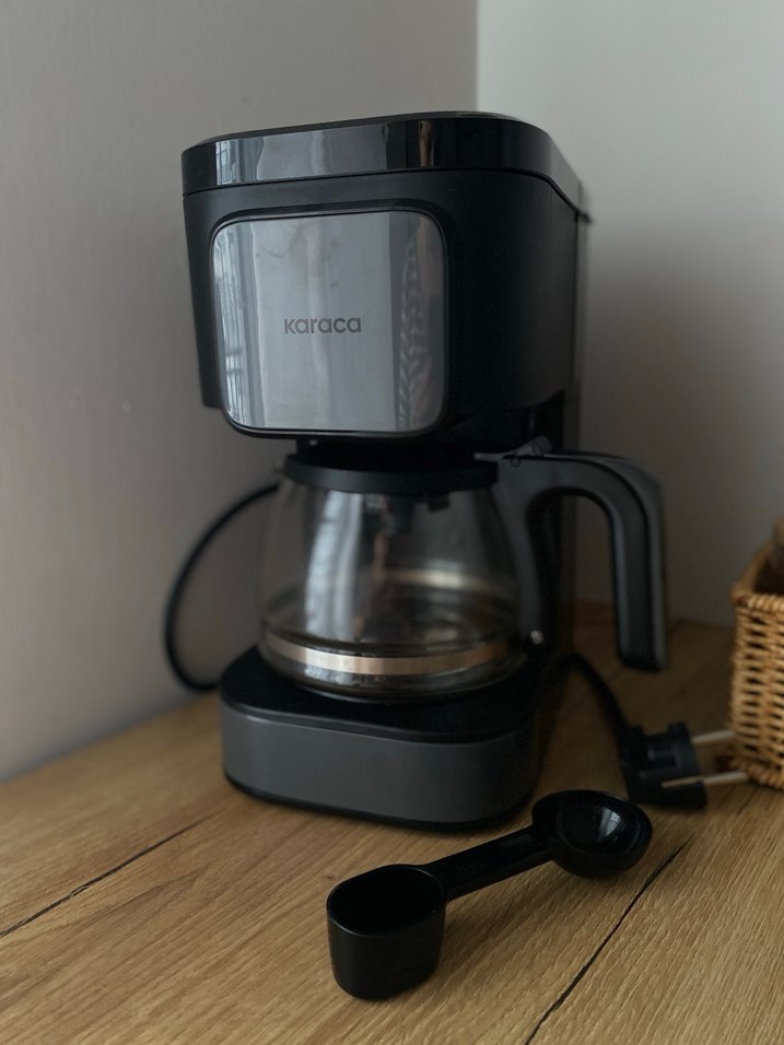 Karaca marka siyah kahve ve cay makinesi, cam sürahisi ve kahve ölçüm kaşığı ile birlikte gelir. Kolay kullanım sağlar. ☕