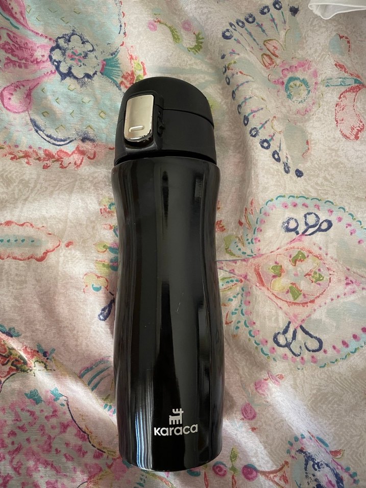 Karaca markalı siyah termos, güvenli kapak ve şık tasarıma sahip, içecekleri sıcak veya soğuk tutar. Taşıması kolaydır. sadece içi paslı