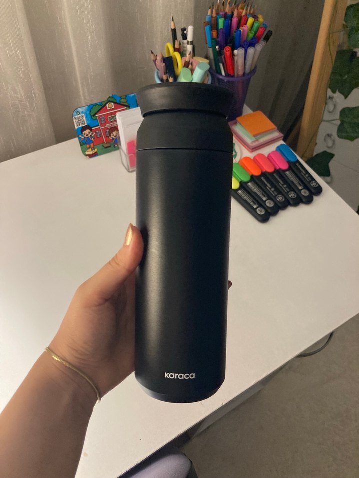 Karaca siyah termos matara, içecekleri sıcak veya soğuk tutmak için dayanıklı ve şık tasarıma sahiptir. Taşıması kolaydır.