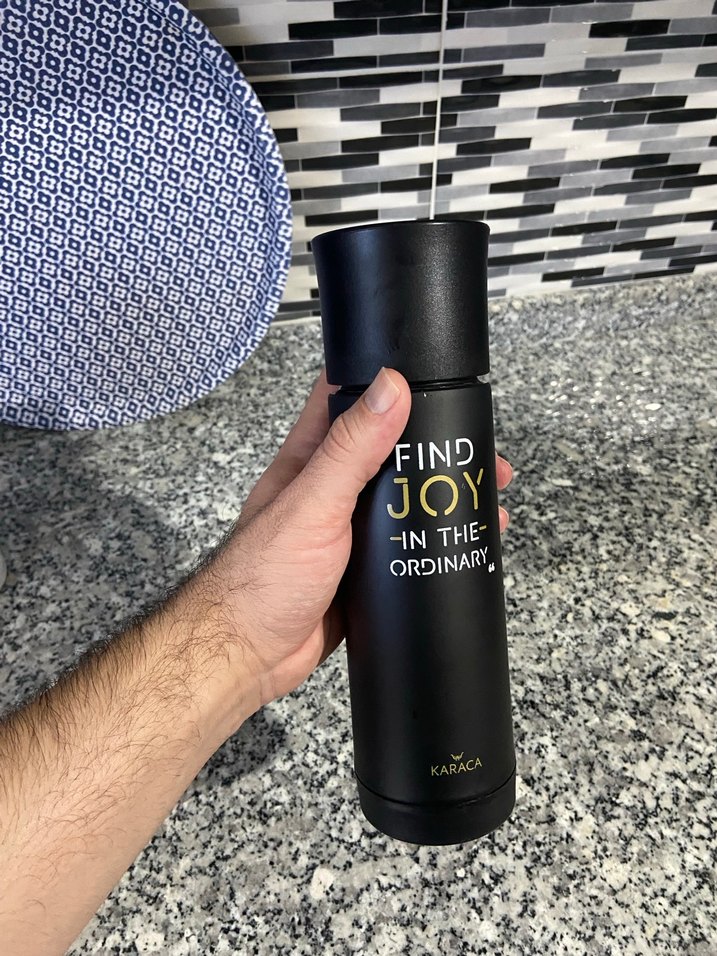 Karaca siyah termos matara, üzerinde ilham verici bir alıntı ile. İçecekleri sıcak tutar, mat yüzeyiyle şık bir görünüme sahiptir. Bize küçük geldiği için satıyoruz orjinal bir eksiği yok İçi dışı tertemiz