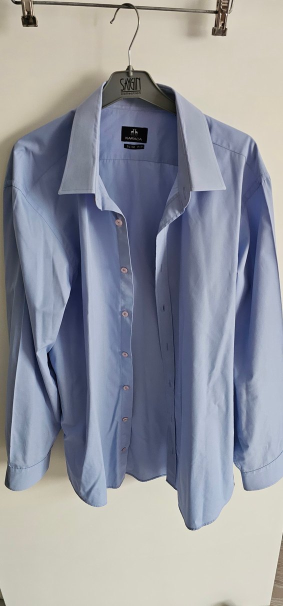 Karaca marka, acik mavi renkli, 'SLIM FIT' yazılı dar kalip erkek XL klasik gömlek. yaka kat yerlerinde gorselde göründüğü uzere deformasyon vardır.