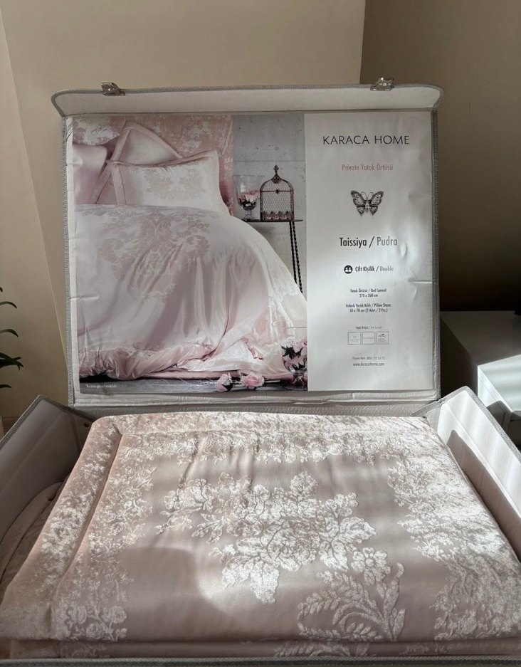 Karaca Taissiya Private pudra rengi yatak örtüsü ve iki yastığı ,çeyiz için alınmıştır çeyize serildi hemen kaldırıldı kutusu ile duruyor kutu ile gönderim sağlanacaktır Hiç kullanılmadığı için yeni işaretliyorum