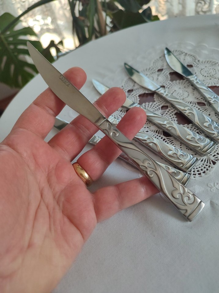 6 adet sıfır kullanılmamış paslanmaz çelik bıçaklar ve gri desenli kulplara sahip bıçak seti. Keskin ağız yapısıyla kullanışlıdır.