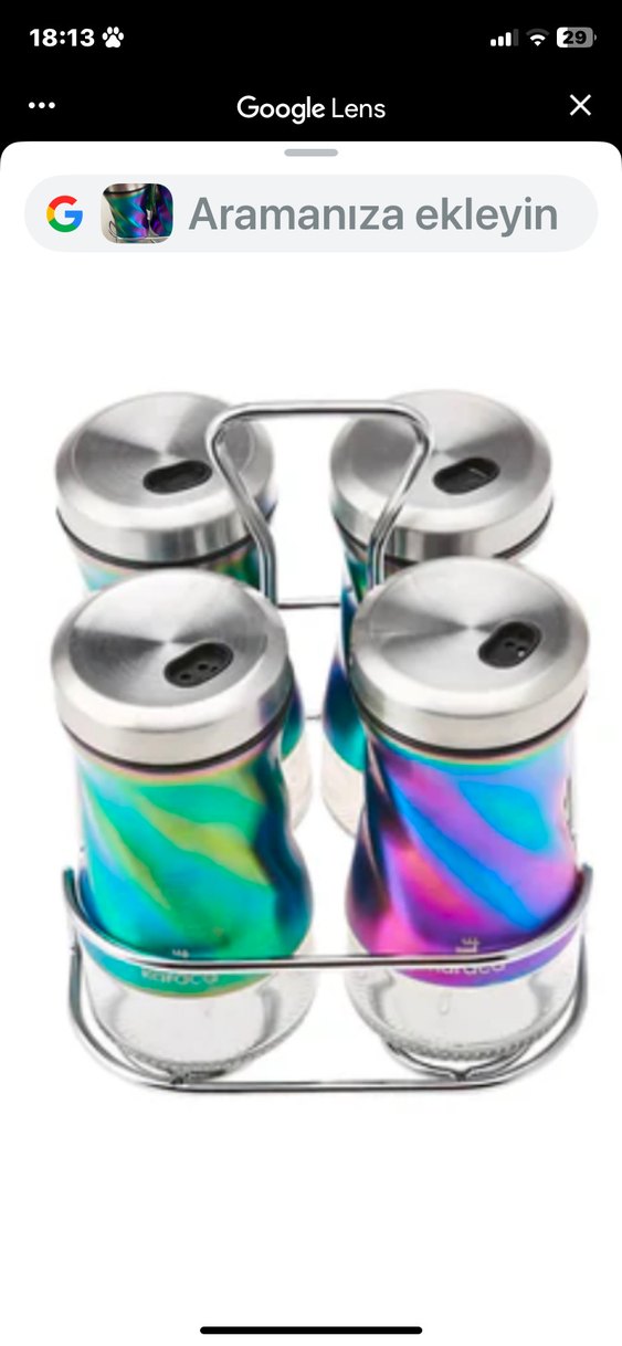 Metal kapaklı ve metal standlı, renkli tasarıma sahip dört baharatlıktan oluşan set.kullanılmamış ürün